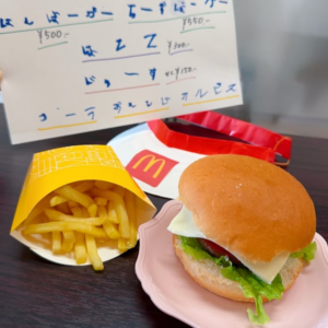 メニュー、ポテト、ハンバーガー、サンバイザー、そしてたすきマネー!すべてが手作りな、たすきマックがオープンします🎊