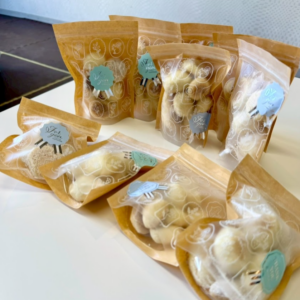 午後はおやつ(味見)&ラッピング!クッキーが冷めたら粉砂糖をかけて完成したスノーボールクッキーを、袋に詰めました🎁