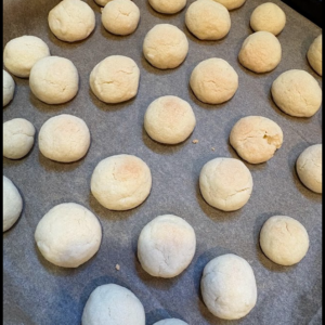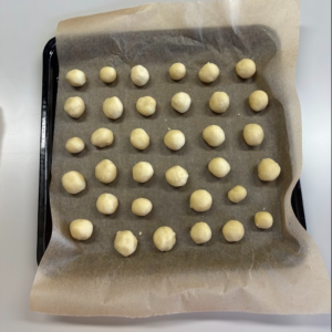 薄力粉、アーモンドプードル、粉砂糖、バターを混ぜて、生地をまとめてクッキーの形に成形して、天板にのせました!
