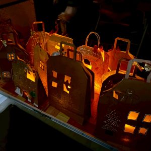部屋を暗くしてライトアップすると、お菓子の家が並んだ夜の街並み🏠とっても幻想的な雰囲気になりました✨