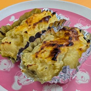 スイートポテト、作って食べたよ! 2025/11/05 サツマイモをつぶして、牛乳混ぜて、形を整えて・・・ 秋になると食べたくなるスイートポテトを作りました☆ 職員の見本を見ながら、形づくりをする子ども達。 楕円の形が難しかったようで「結構難しいなぁ」と形作りに 奮闘しつつも「楽しい」と嬉しそうな表情も見せてくれました。 オーブンから焼きたてのスイートポテトを見つけて、 「おいしそう!」「早く食べたーい♡」と 待ち遠しい子ども達。 調理から完成まで時間はかかったけど、甘くてホクホクな スイートポテトに子ども達・職員皆うっとりでした(#^.^#)