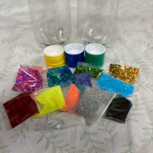 水とラメを入れた後に、上下2本のペットボトルを穴を開けたキャップを閉めてビニールテープでつないで完成!