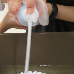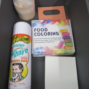まず職員と一緒にシェービングフォームを箱に向かって出して、