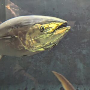 水族園の目玉、巨大なクロマグロの回遊水槽では驚きのハプニングが。 みんなで水槽を覗き込んでいたその時、一匹の大きなマグロが口を大きく開けて真正面からこちらへ突進! 「食べられちゃう〜!(;゚Д゚)」と思わずのけぞる子どもたち。職員もびっくりするほどの迫力で、まさに「奇跡のシャッターチャンス」でした。笑