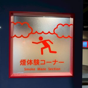 煙体験では、口をおさえて、身をかがめて、煙を吸わないように避難する体験!